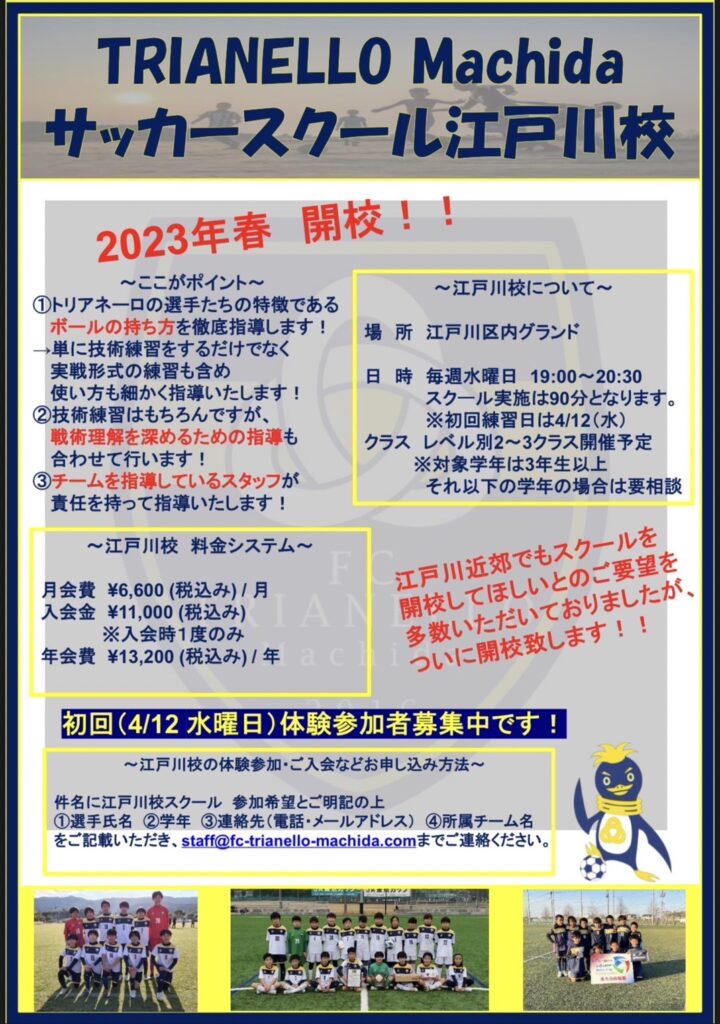 江戸川校 2023年春開校のお知らせ「TRIANELLO Machida サッカースクール江戸川校」 2023年3月30日 ニュース 2023年春、「TRIANELLO Machida サッカースクール江戸川校」を開校いたします!! 詳細は下記よりご確認ください URL Copied!