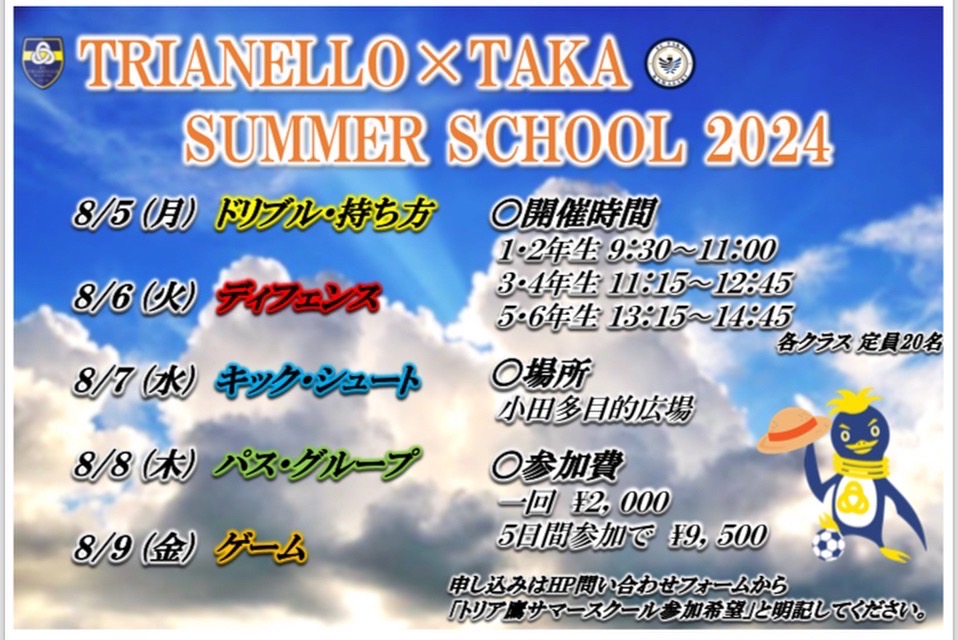 今年度より鶴間公園で開催したサマースクールですが、『トリアネーロ×鷹サマースクール2024』を今年も小田多目的広場で開催いたします‼️