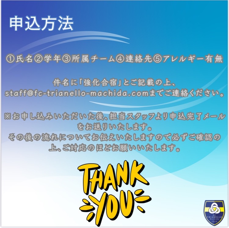 お申込みは、①〜⑤の必要事項を記載の上、staff@trianello-machida-official.com迄ご連絡下さい。
