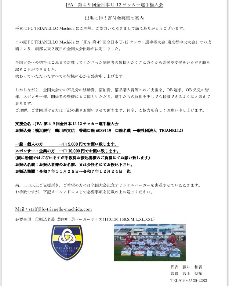 JFA 第49回 全日本U-12サッカー選手権大会出場に伴う寄付金募集のお願い